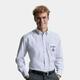 - cuello abotonado a ambos lados, bolsillo pectoral a la izquierda, perchera trasera con dos pliegues laterales en el canesú, pliegue de caja con costura trasera, puños inclinados ajustables con dos botones, dobladillo curvado