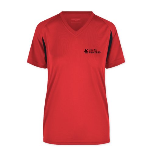 Camiseta funcional de poliéster blanca y roja para mujer con cuello en V.