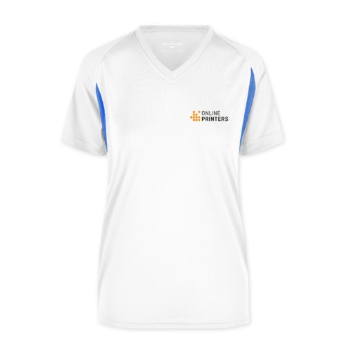 Camiseta funcional de poliéster blanca y azul para mujer con cuello en V.