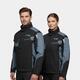 Chaqueta de trabajo negra y gris de tela mixta con cremallera completa y bolsillos laterales.
