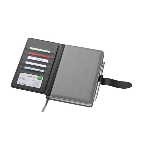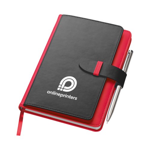 - cuadernos A5 con 256 páginas rayadas, solapa y portabolígrafos