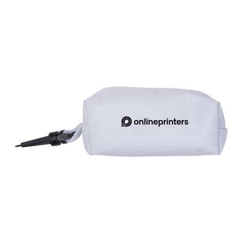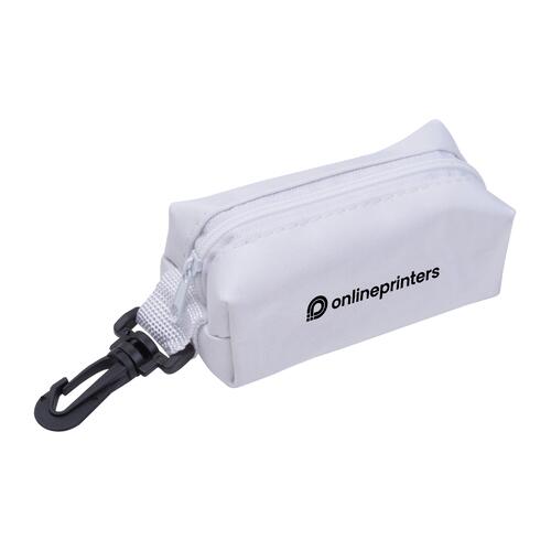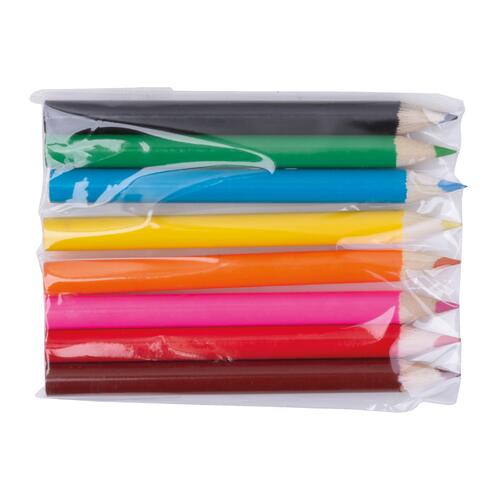 - Estuche de poliéster con cremallera, mosquetón de plástico y ocho lápices de colores diferentes