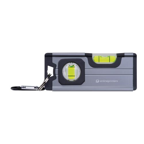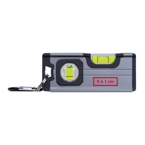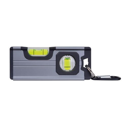 - Mini nivel de aluminio con aplicaciones de plástico ABS, dos burbujas de nivel, imán en la parte inferior y un mosquetón