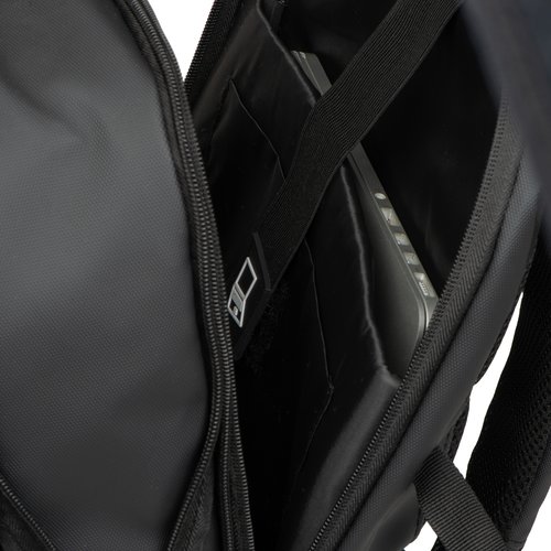 • Además, incluye un puerto USB con cable, dos asas de transporte, una correa para el trolley, correas acolchadas para los hombros, espalda acolchada y una cremallera para ampliar la mochila