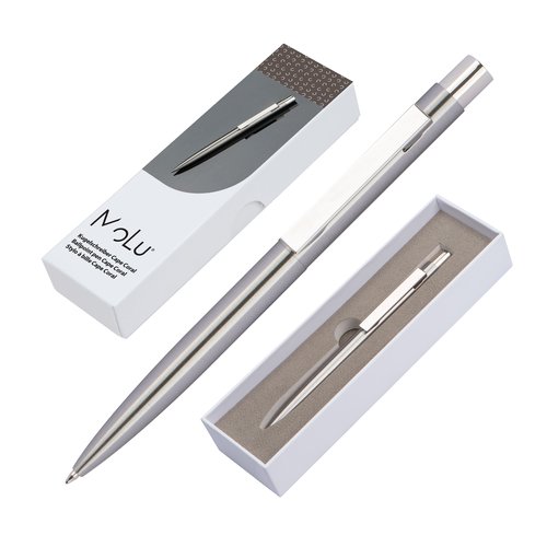 Los artículos publicitarios de MOLU son algo más que un regalo. Son una apuesta por el «lujo moderno» y por un aprecio especial; desde el momento de abrir el regalo hasta toda su larga vida útil. Este exclusivo bolígrafo convence con su estilo clásico con superficie con cepillado mate, su función de click y su carga intercambiable.
