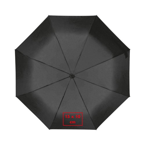 - Paraguas automático de bolsillo con estructura de fibra de vidrio y cubierta hecha de botellas PET recicladas, mango de madera y correa para la muñeca