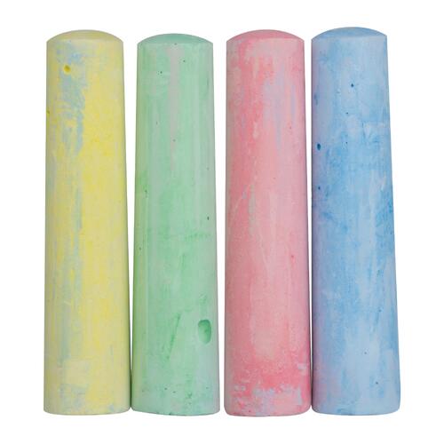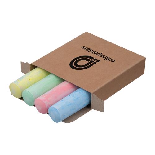 - Set de tizas para dibujar en la calle compuesto por 4 tizas en color azul, rojo, verde y amarillo, presentadas en una caja de cartón